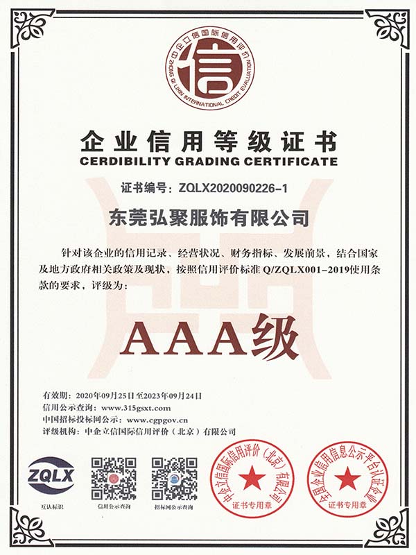 熱烈祝賀弘聚服飾榮獲AAA企業(yè)信用認(rèn)證